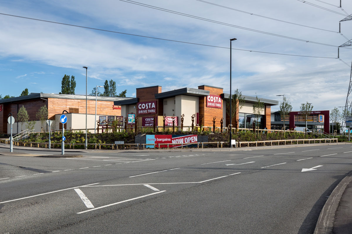 An exciting new retail park for Aldi, Costa Coffee, Greggs, Frankie and Benny’s and the discount store Home Bargain. The site has 150 car-parking spaces and includes a drive-through coffee shop.